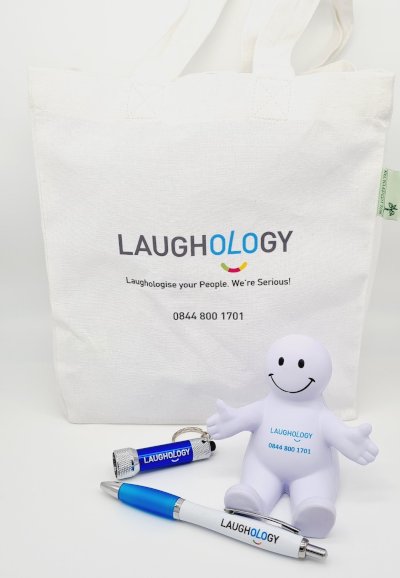 Laughology Screen printed party bag, printed pen, engraved torch and printed squdgy mouse holder.