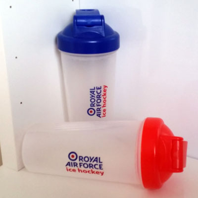 RAF Ice Hockey Team Personalised protein shakers, multi-colour print and caps.