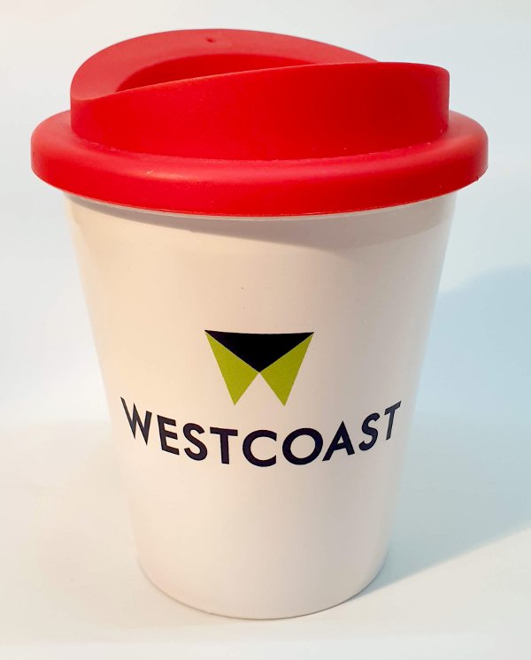 WestCoast 250ml Universal reusable coffee cups / tumblers; 2 colour print with red lid.